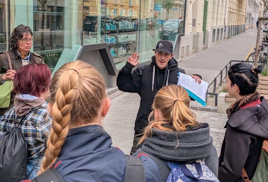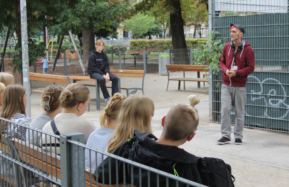 Die Tour hingegen stellt ein umfassenderes Bildungsangebot dar und erweitert den Vortrag. Sie setzt auf Erlebnispädagogik – die Schüler*innen durch verschiedene Stationen im Freien führt und Erzähltes visuell mit den Orten des Geschehens verbindet. Sie deckt ein breites Themenspektrum ab, das von Sucht und deren Folgen bis hin zum Leben auf der Straße reicht.